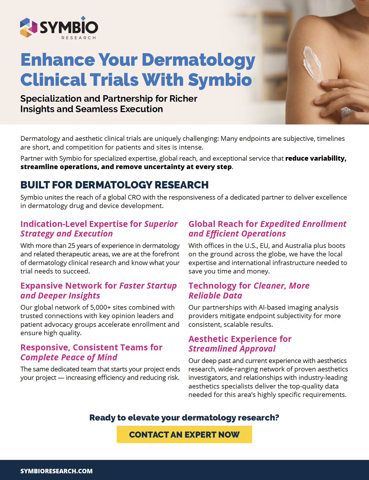 Dermatology and aesthetic clinical trials are uniquely challenging: Many endpoints are subjective, timelines are short, and competition for patients and sites is intense. Partner with Symbio for specialized expertise, global reach, and exceptional service that reduce variability, streamline operations, and remove uncertainty at every step.